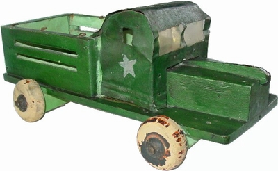 Met eenvoudige middelen werd in een periode van schaarste speelgoed gemaakt, zoals Amerikaanse legertruck gemaakt van hout en blik. Daaronder een jeep van hout met canvas dak en met het invasie teken op de motorkap.