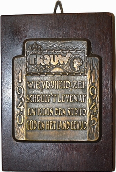 Een grote plaquette van gips, bronskleurig. Hierop de tekst: