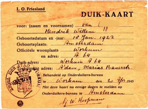 Duik-kaart. Document van het Onderduikers-bureau te Workum waarmee de desbetreffende persoon zich moest melden op het Onderduikers-bureau te Amsterdam, afgegeven op 20 april 1945.